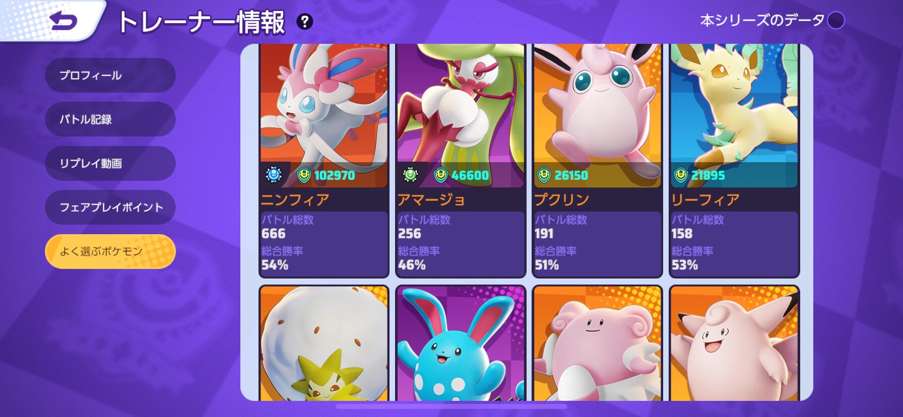 トレーナー情報に表示されるポケモンを好きなポケモンにして、勝率を飾ってあげたい!!というのが私の最大のプレイ動機の片方です。もう片方は好きなポケモンの性能を深く理解して私なりにうまくプレイすることです。