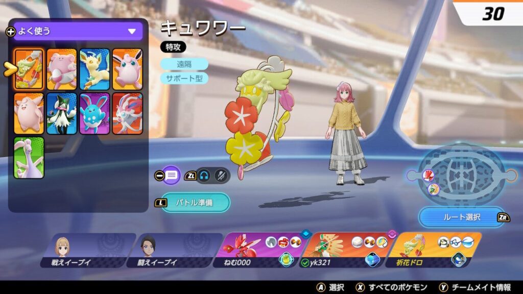 1位キュワワー:単体ヒーラー。草結びでの補佐や乗り降り判断が絶妙です!