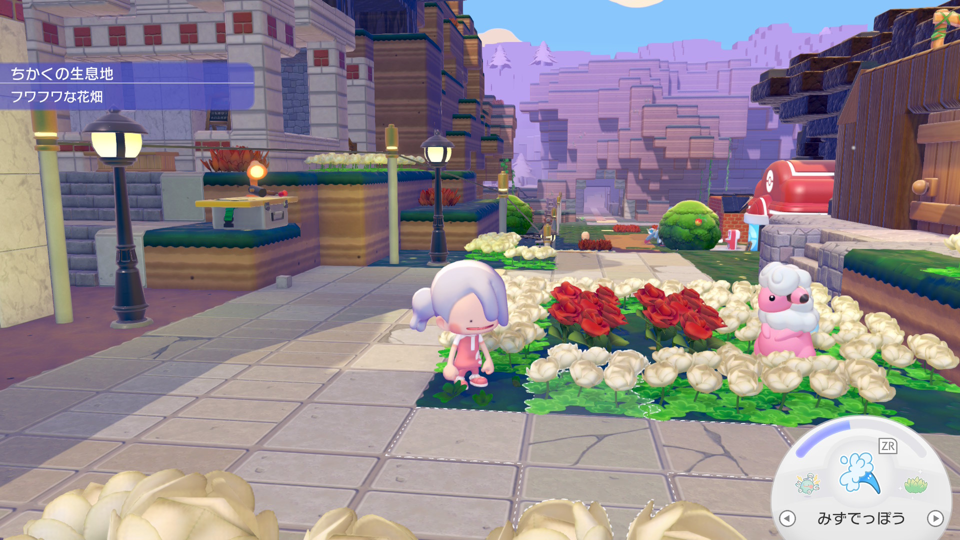 ふたりとも植物を。ニャオハは浮き島のフワフワの花で、リーフィアは優雅な白い花をあげる!