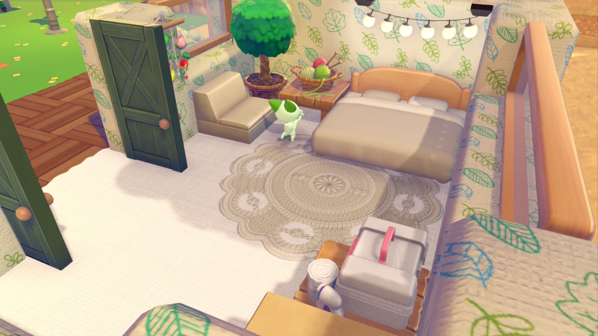 リーフィアはキズをいやすが好きだから救急箱。ニャオハは入れ物が好きだから段ボール。あと猫だから毛糸玉。