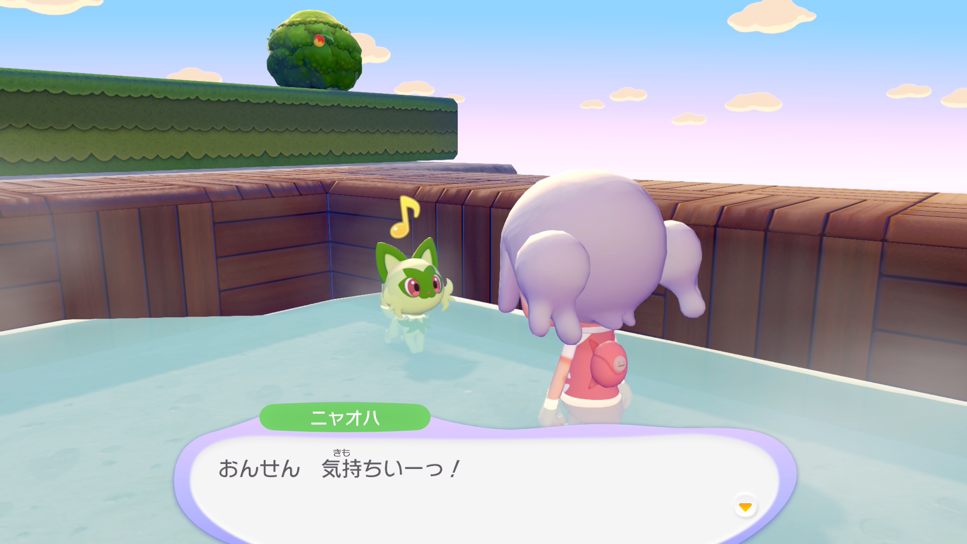 私が作った温泉にニャオハが入ってくれた